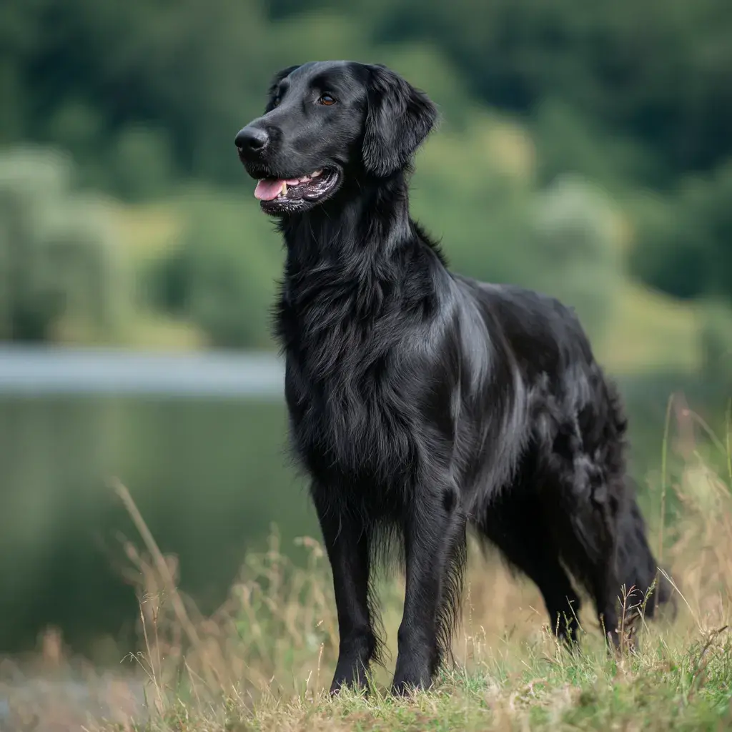 Flat coated retrívr je jeden z méně známých retrívrovských plemen, ale mezi znalci je vysoce ceněn pro svou pracovní schopnost a nezapomenutelnou osobnost. Pochází z Velké Británie, kde byl vyšlechtěný v 19. století jako lovecký pes pro aportování střelené vodní ptactva. Je to velký pes (samci až 62 cm, 27-36 kg) s elegantní, atletickou postavou, dlouhýma nohama a charakteristickou hladkou, lesklou černou nebo jaterní (hnědou) srstí bez vln. Flat coated retrívr má extrémně živý, nadšený temperament - často popisován jako "věčné štěně" nebo "Peter Pan" mezi psy, protože si udržuje štěněcí nadšení po celý život. Je extrémně přátelský ke všem - lidé i psi. S rodinou je extrémně láskyplný a náladný. S cizími lidmi je přátelský - žádná rezervovanost.