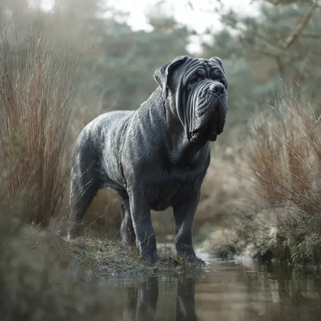 Neapolský mastin je starověké plemeno z jižní Itálie (oblast Neapole, minimálně 2000+ let) používané jako hlídač, válečný pes a pes pro psí zápasy. Je to obří pes (50-70 kg, někteří až 90+ kg) s charakteristickou masivní, mohutnou, těžkou stavbou, EXTRÉMNĚ vroubkovanou kůží (záhyby) pokrývající celé tělo zejména hlavu, krk, obrovskými dewlaps (kožní záhyby) pod tlamou visícími až k hrudi, masivní hlavou s hlubokými záhyby, slinícími ústy a impozantním "zastrašujícím" vzhledem. Neapolský mastin má klidnou, loajální, ochranářskou, důstojnou, nezávislou povahu - "serious dog", velmi klidný doma, ale EXTRÉMNĚ ochranářský. S rodinou je loajální, oddaný, láskyplný (ale ne přehnaně), ochranářský.