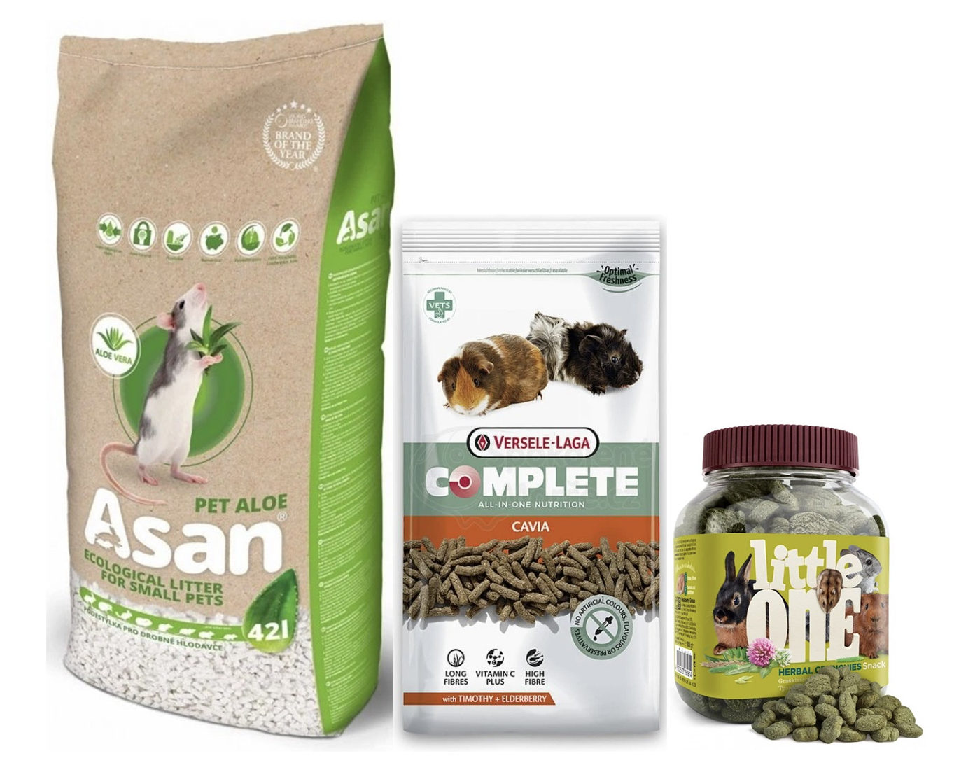 Balíček morče – Asan aloe42 l , krmivo 1,75 kg, pamlsky