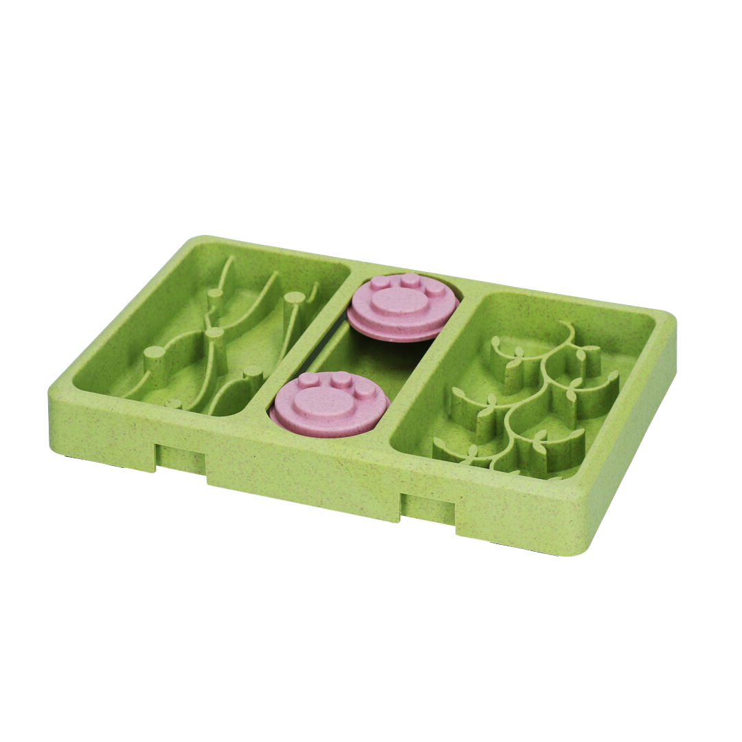 Zelený hlavolam s červenou turbínou uprostřed, a právě tam schovej pamlsky nebo menší granule. Když pejsek turbínu roztočí čumákem nebo packou na jednu či druhou stranu, dobroty se přesunou do bočních částí s vlnkami a kostičkami, které mu získání odměny pěkně ztíží. Skvělá zábava i mentální výzva v jednom!
