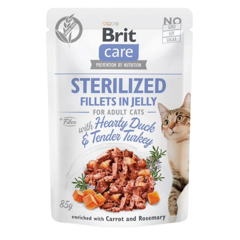 Brit Care Cat STERILISED filetky v želé s vydatnou Kachnou jemným Krůtím. Obohaceno o Mrkev a Rozmarýn.