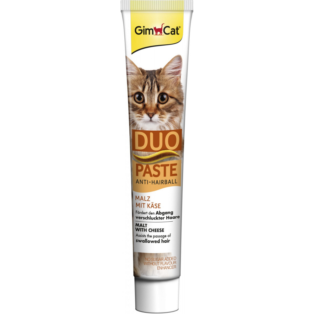 GimCat Anti-Hairball Duo-Paste se sýrem je lahůdková pasta se sýrem. Skvěle kombinuje chuť a přírodní maltozu, která pomáhá vylučovat spolykané chlupy.