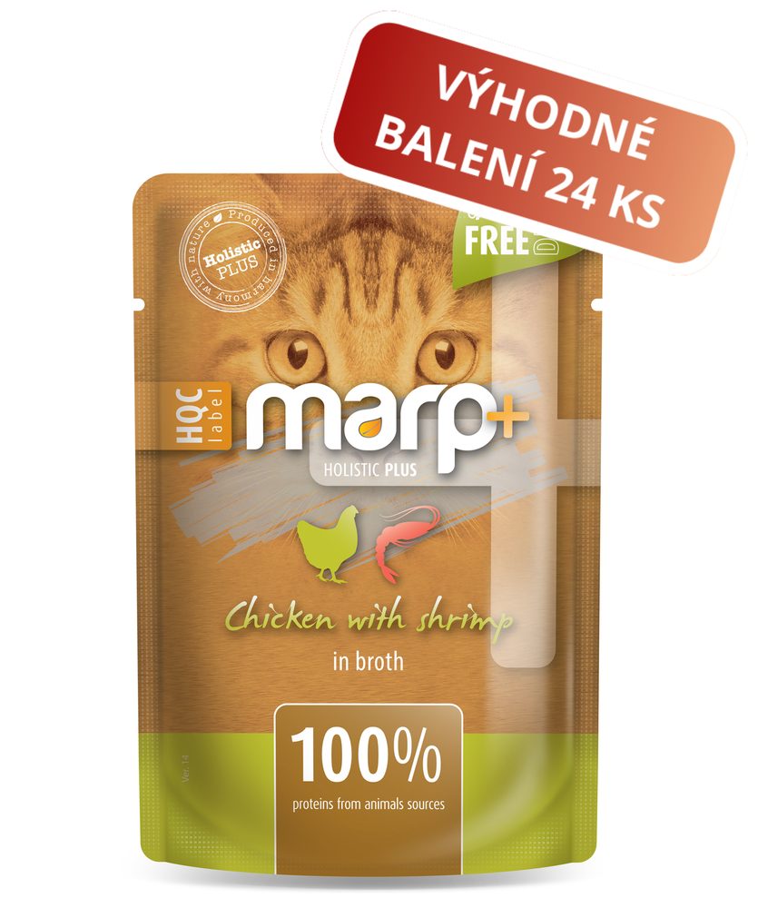 Kousky kuřecích prsou s celými krevetami v lahodném vývaru – žádné vnitřnosti, žádné umělé doplňkové látky, žádné obiloviny – to jsou špičkové kapsičky Marp Holistic Plus pro kočky. Respektujeme kočku jako masožravce, a proto pochází 100 % bílkovin ze živočišných zdrojů. Toto krmivo bude vaše kočka skutečně zbožňovat.