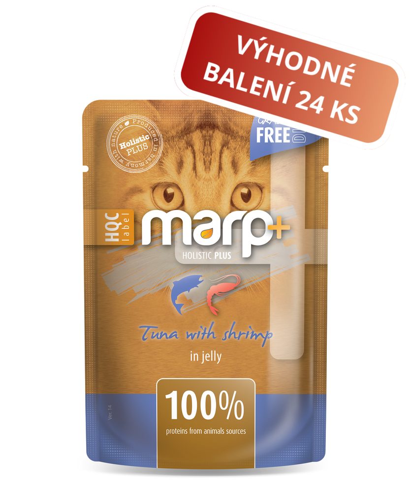 Tuňák s celými krevetami v želé – žádné vnitřnosti, žádné umělé doplňkové látky, žádné obiloviny – to jsou špičkové kapsičky Marp Holistic Plus pro kočky. Respektujeme kočku jako masožravce, a proto pochází 100 % bílkovin ze živočišných zdrojů. Toto krmivo bude vaše kočka skutečně zbožňovat.