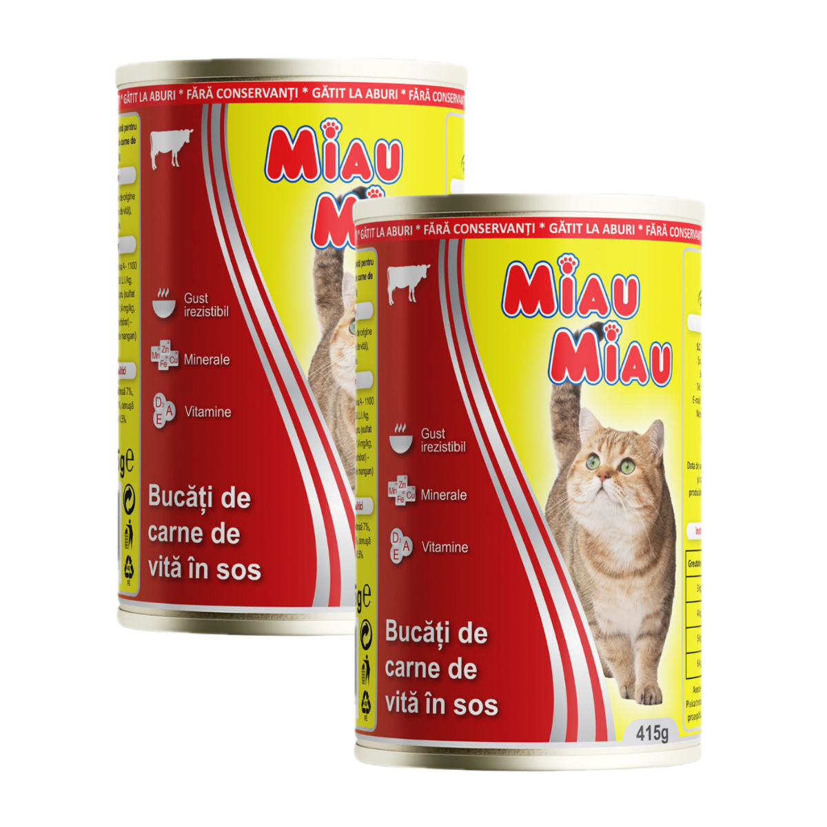 Pro tento produkt nejsou k dispozici žádné nabídky. Miau Miau konz. Adult Beef – 2 x 415g Popis produktu Popis Miau Miau konzerva je kompletní krmivo s hovězím masem pro dospělé kočky