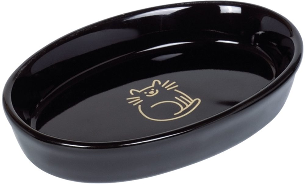 Oválná keramická miska pro kočky Stylová černá miska s jemným zlatým motivem kočky je vhodná na vodu i krmivo.