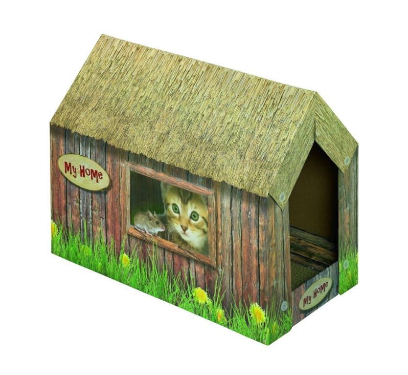 Domeček pro kočku vyrobený z pevného kartonu. Rozměry 49x26x36 cm. Uvnitř podložka jako kartonové škrabadlo.
