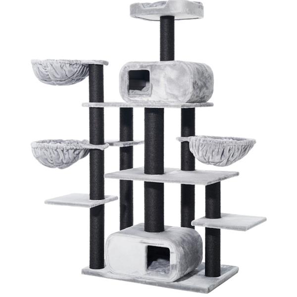 Škrabadlo je potažené měkkým plyšem a vybavené dvěma prostornými domečky s polštářky, třemi průvěsy, mnoha plošinami k odpočinku a vyhlídkou pro pozorování okolí. Díky své stabilní konstrukci je vhodné i pro domácnosti s více kočkami.