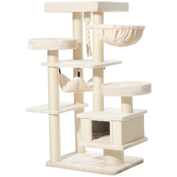Součástí škrabadla je prostorný domeček s měkkým polštářkem, tři vyhlídky pro pozorování okolí, šplhací lano, kruhový průvěs a pohodlná hamaka. Díky své stabilní konstrukci a velkým rozměrům je vhodné i do domácností s více kočkami.