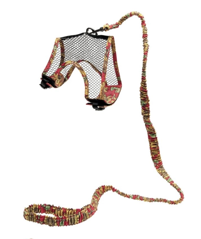 Barevný postroj s vodítkem na králíky. Díky postroji bude tah rovnoměrně rozložen na celé tělo živočicha. To zajišťuje nejen pohodlí, ale i bezpečnost.