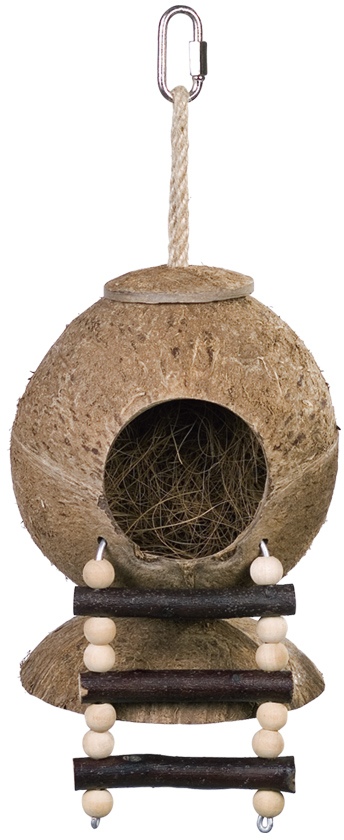 Kokosový domek s žebříkem pro zavěšení do klece. Celkový rozměr 31 cm, kokos ø 11,5 cm.