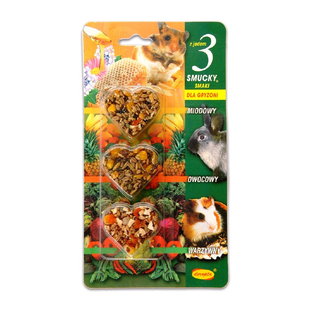 Krmivo pro hlodavce ve tvaru srdíčka ve třech příchutích: medové, ovocné a zeleninové.