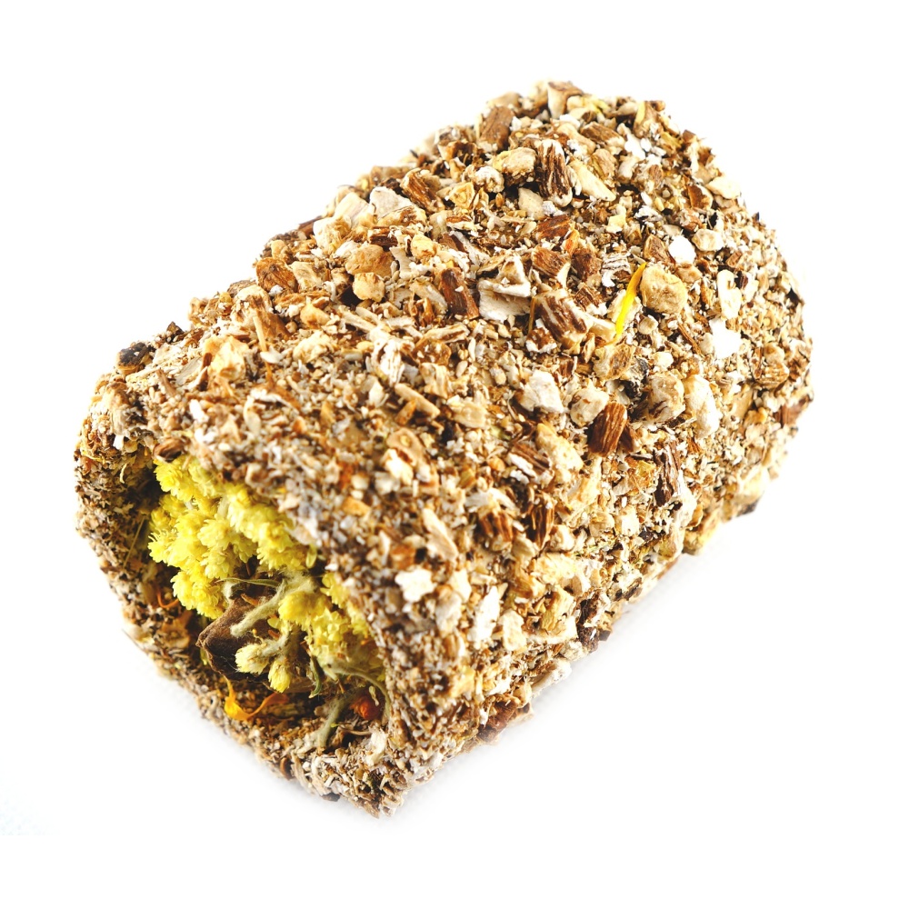 Bylinková bezobilná přírodní pochoutka pro hlodavce ve tvaru tunelu na roli s kořenem pampelišky, topinamburem a slaměnkou.…