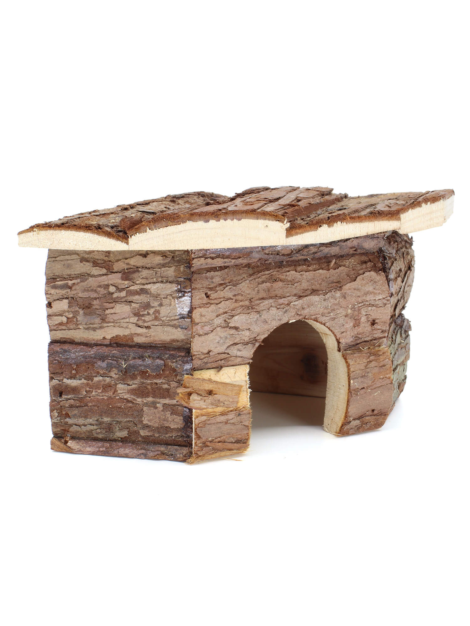 Domeček pro hlodavce je vyrobený ze dřeva.
