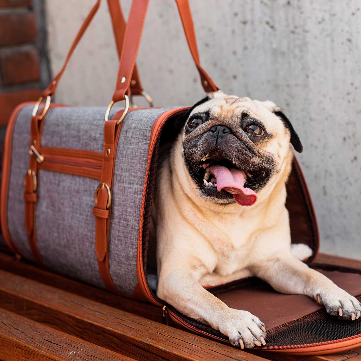 Cestovní tašku pro psa můžete přehodit přes rameno nebo ji uchytit do ruky. Velmi elegantní design, který působí luxusně, ocení majitelé menších psích plemen. Velikostně je taška vhodná pro pejsky do 3 kilogramů. Pevná konstrukce a kvalitní materiál drží tvar. Psí taška disponuje pevným dnem. Při ušpinění lze tašku omýt. Součástí háček na obojek a mnoho kapsiček na doklady či pamlsky.