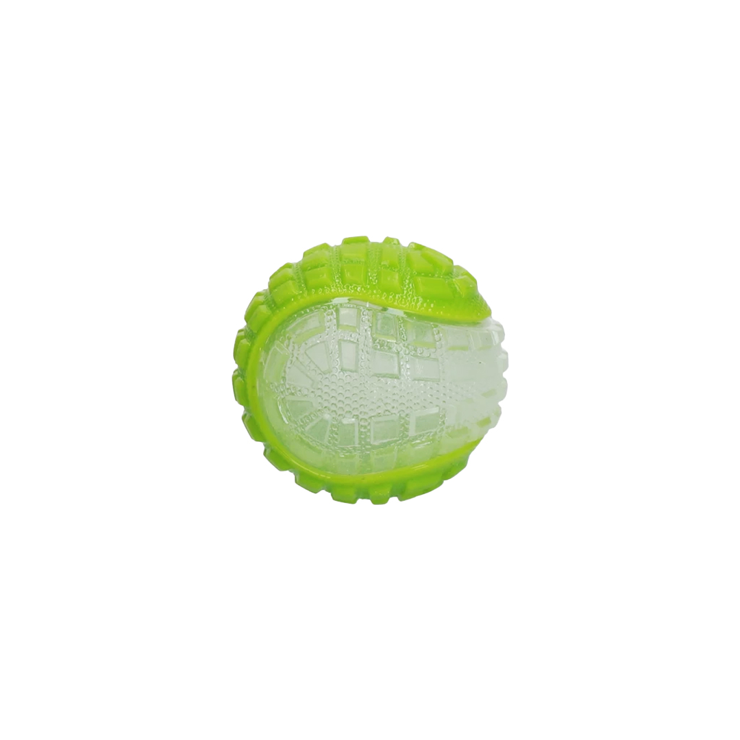 Průhledná část míčku svítí ve tmě, díky čemuž je míček dobře viditelný. Vodomilové budou mít také velkou radost, perfektně plave na vodě a skvěle skáče. Pískadlo ukryté uvnitř míčku poskytuje extra stimulaci při hraní. Jemné výstupky na míčku zlepšují jeho držení v tlamičce i v rukách, i když je míček vlhký.