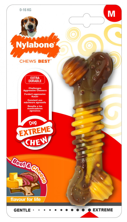 Extreme Chew jsou navrženy pro psy se silným skusem. Hrbolky pomáhají čistit zuby a redukují tvorbu plaku a zubního kamene během žvýkání. Řeší problém s agresivním kousáním. Uspokojuje přirozenou potřebu žvýkání. Příchuť hovězího se sýrem