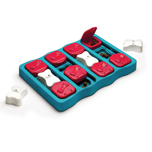 Vyndejte z hlavolamu všechny bílé kostky a odsuňte červené posuvné šuplíčky. Schovejte lákavé pamlsky pod ně i pod bílé kostky. Nakonec vložte pamlsky i do odklápěcích částí. Podle zkušeností svého pejska nechte šuplíčky otevřené nebo zavřené. Bílé kostky přidávejte až už bude váš rebel v posouvání šuplíčků zběhlý. Stydlivkám ukažte, jak hlavolam funguje, spolupracujte a nechte pejska, aby se s vámi učil. Psi jsou chytřejší než si myslíte! Pokud pejsek ze začátku tápe, udělejte mu výzvu jednodušší.