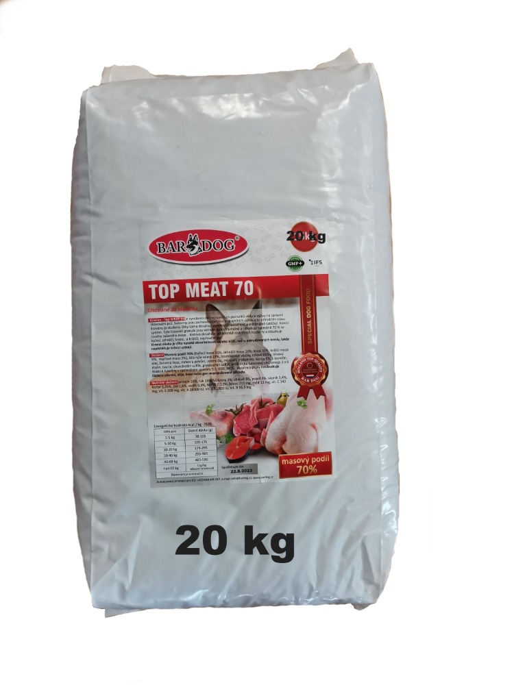 Chovatelské balení Bardog Top Meat 70 – 20 kg. Lisované granule s 70 % masa, zachovávají živiny a chuť. Kompletní výživa pro dospělé psy všech plemen.