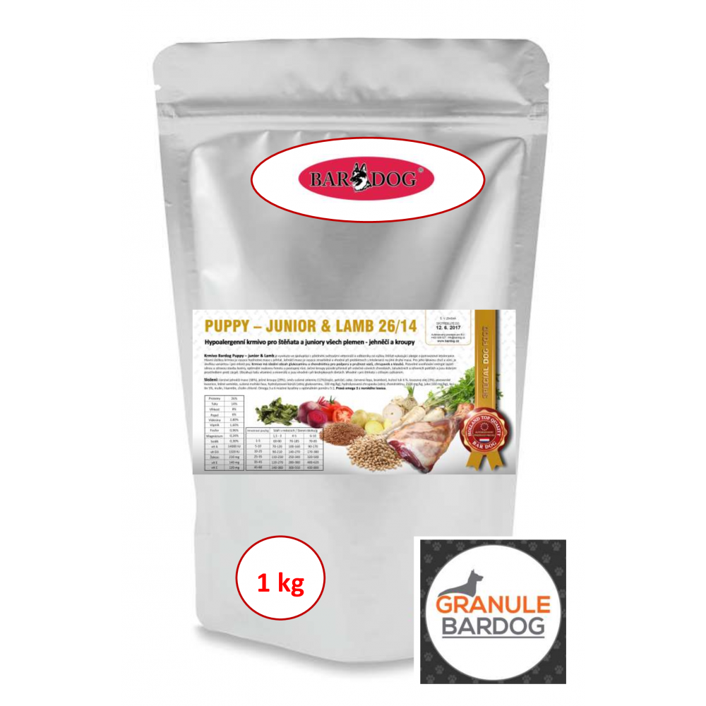 Testovací balení 1 kg hypoalergenních granulí Bardog Puppy Junior Lamb 26/14. S jehněčím masem a zeleninou, pro zdravý růst a imunitu štěňat všech plemen.