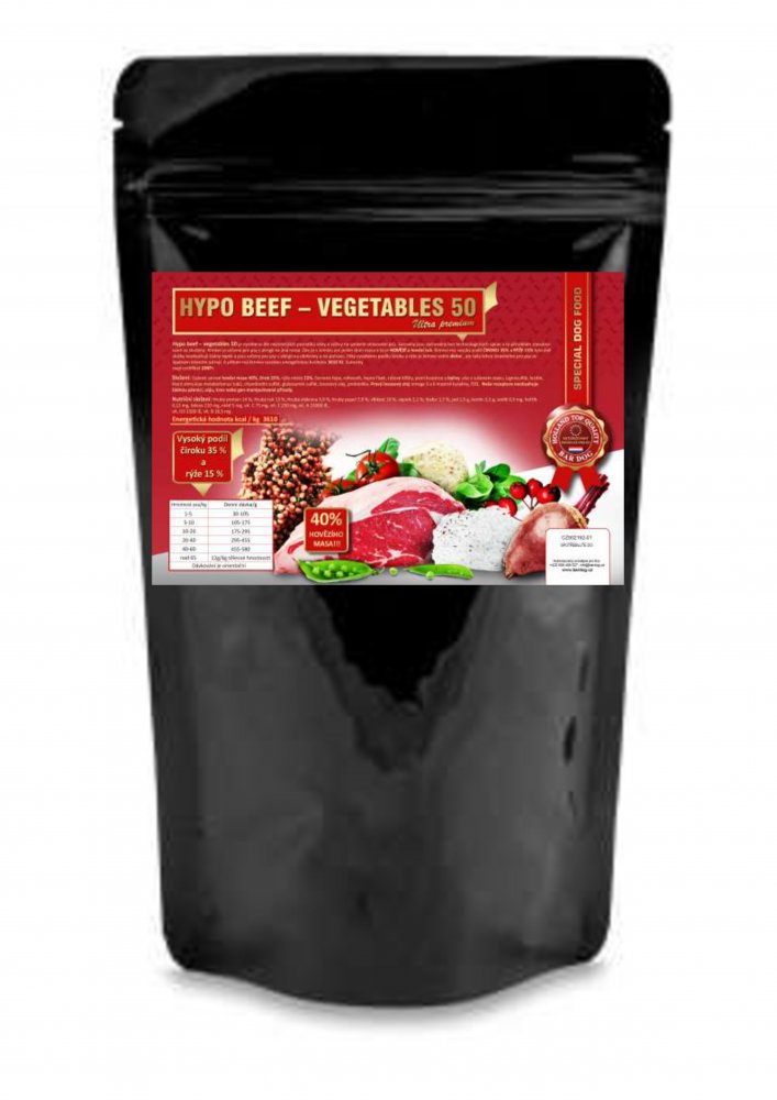 Testovací balení 1 kg hypoalergenních lisovaných granulí Bardog Hypo Beef Vegetables 50. Obsahují 50 % hovězího masa a zeleninu jako lehce stravitelný zdroj energie. Bez obilovin, pšenice a sóji. Vhodné pro psy s citlivým trávením.