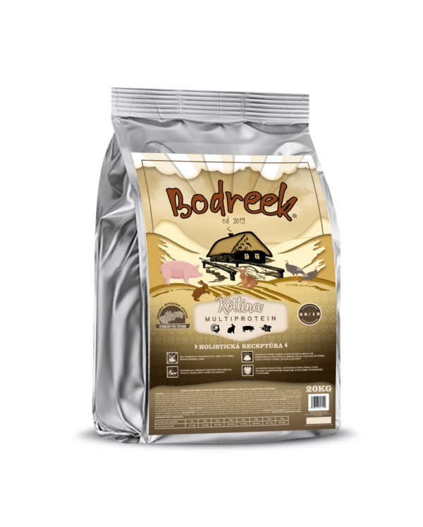 100% přírodní holistické krmivo Bodreek Kotlina s jeřabinou. Vyrábí se na Slovensku ze surovin místních farmářů. Tři pečlivě kombinované zdroje masa zajišťují komplexní škálu aminokyselin. Zelenina a sušené ovoce doplní vitamíny a minerály.