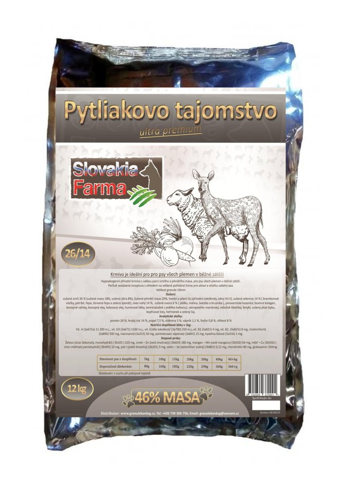 Hypoalergenní granule SlovakiaFarma Pytliakovo tajomstvo 26/14 jsou kompletní krmivo pro dospělé psy všech plemen. Receptura se srnčím a jehněčím masem je vhodná pro psy s citlivým zažíváním nebo potravními alergiemi. Granule obsahují oves jako zdroj energie a vlákniny. Poměr živin je 26 % bílkovin a 14 % tuku. Granule mají kulatý tvar, střední velikost a pevnou strukturu. Výroba probíhá na Slovensku bez použití GMO, sóji a chemických konzervantů.
