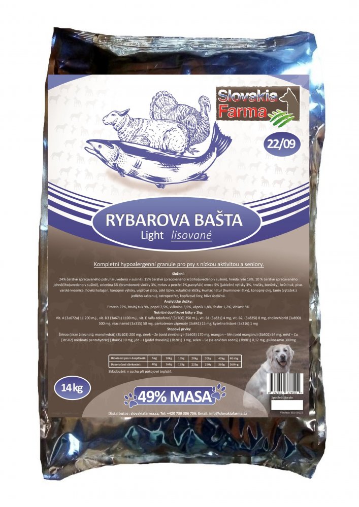 Granule Slovakia Farma – Rybarova bašta 22/09 jsou určené pro psy všech plemen. Díky svému dietnímu složení jsou vhodné pro psy s nízkou aktivitou, seniory, psy s nadváhou, nebo na dietě.