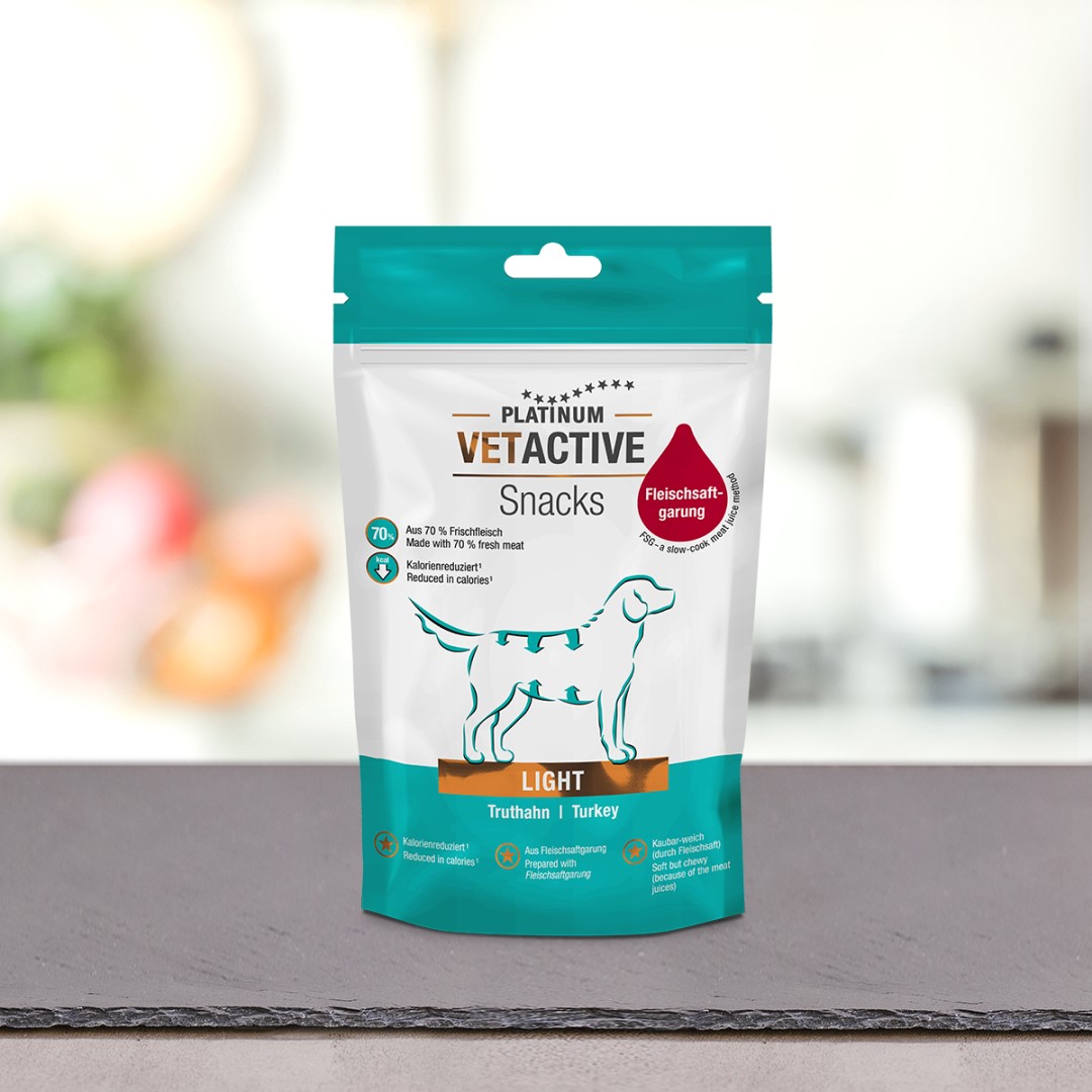 Pečlivě vybrané a dobře snášené ingredience dělají z PLATINUM VETACTIVE Light Snack skutečný kulinářský zážitek.