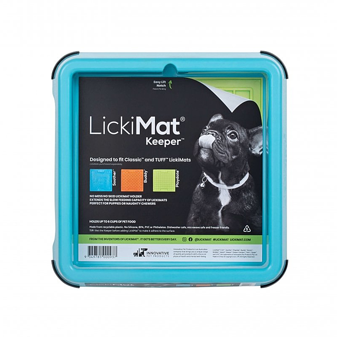 Lickimat Keeper je plastová miska speciálně vytvořená na vložení LickiMat podložky. Okraj vysoký cca 4cm vytvoří pro lízací podložku skvělý prostor. Díky protiskluzovým gumám v rozích misky zabrání při nadšeném olizování posouvání lízací podložky a zároveň brání rozhazování kousků potravy do okolí. Nenechaví pejsci zároveň nemohou podložku zvedat ze země a okusovat. Kombinací Keeperu s lízací podložkou také získáte vyšší okraj a lízací podložku pak můžete využít také jako misku na větší množství potravy. Keeper má patentovaný zářez na vnitřní straně okraje, aby se z něj lízací podložka snadno vyndavala vám, nikoliv vašemu mlsounkovi.