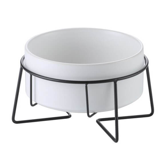 Miska pro psa je vyrobena z keramiky, podstavec z kovu.
