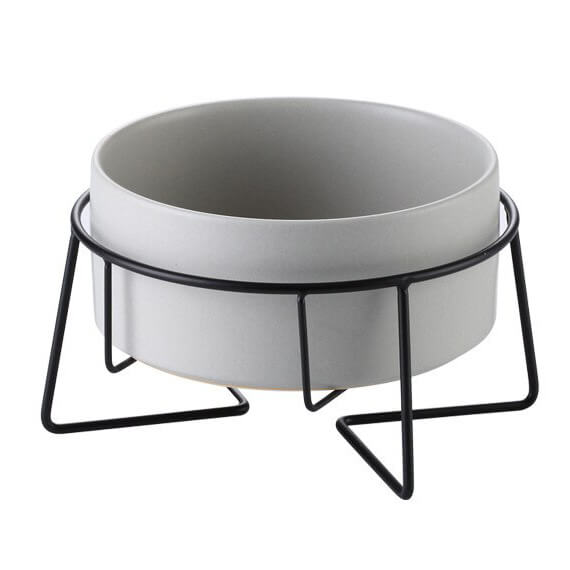 Miska pro psa je vyrobena z keramiky, podstavec z kovu.