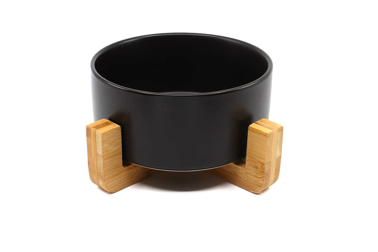 Miska pro psa vyrobena z keramiky na dřevěném podstavci.