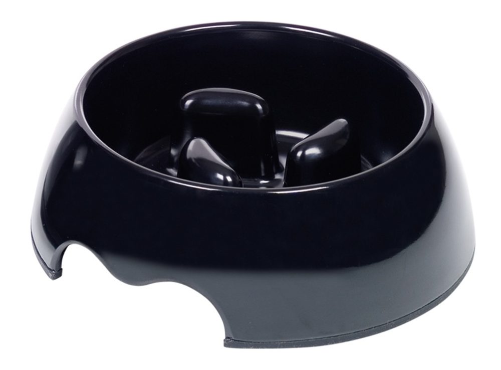 Melaminová miska zpomalující příjem potravy Plastová miska se speciálně tvarovaným dnem, které zpomaluje příjem potravy a zabraňuje hltání. Pomáhá tak předcházet nadměrnému polykání vzduchu, trávicím potížím a snižuje riziko torze žaludku.
