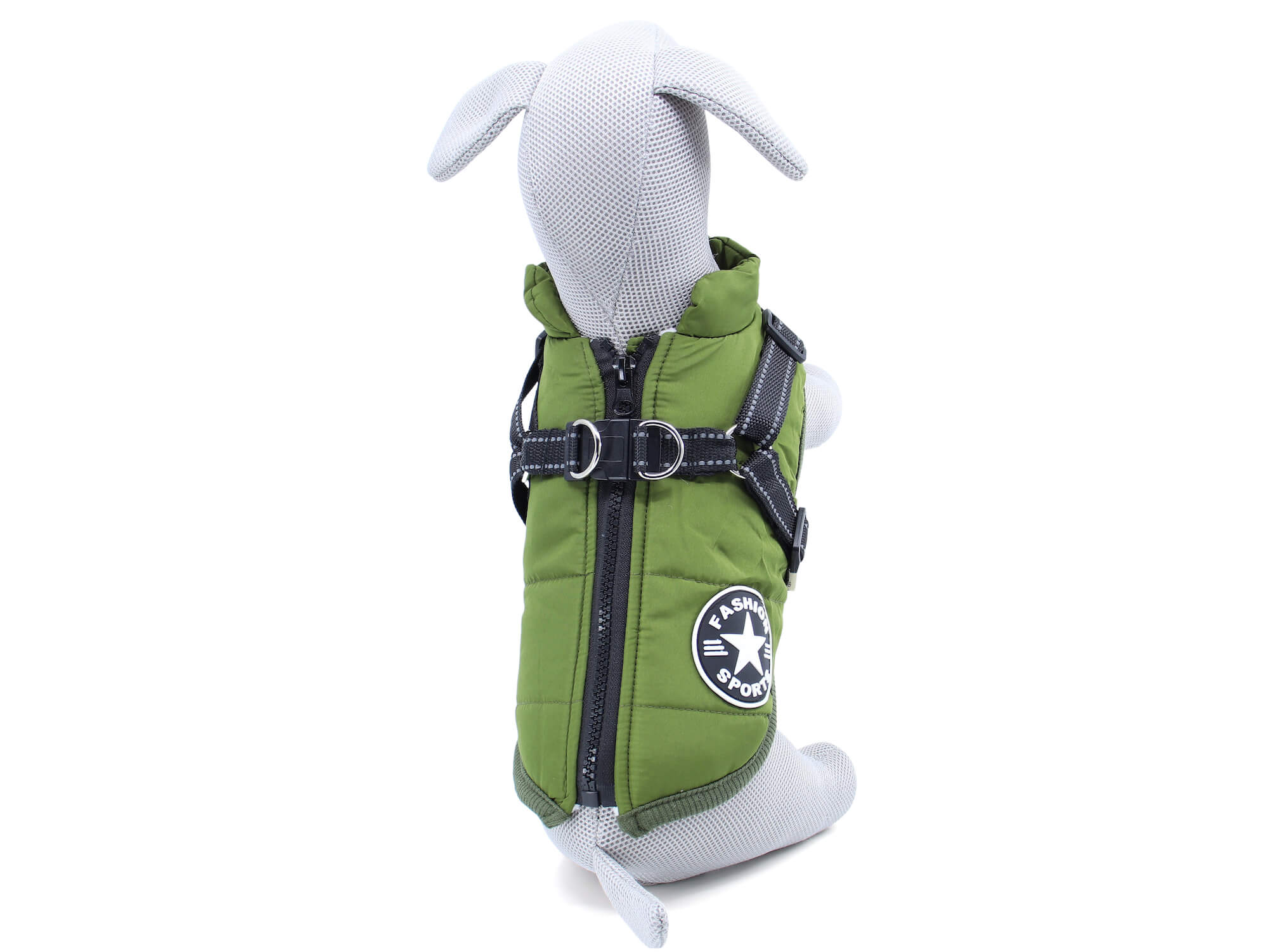 - Zapněte: Vložte ruku pod zip na kraji bundy a zip zapněte. Postroj zapněte a stáhněte dle potřeby, tak aby obepínal tělo psa.