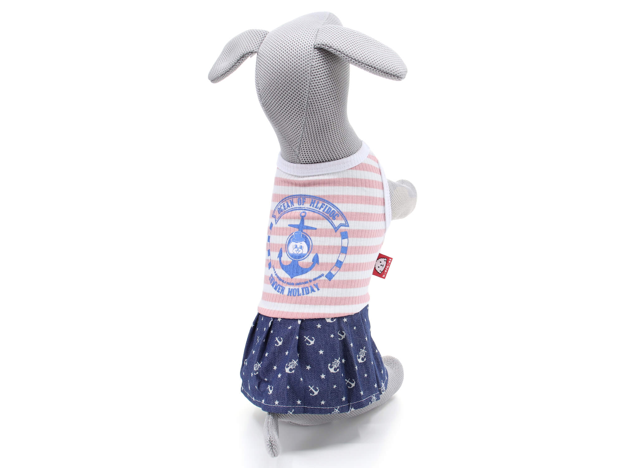 Bavlněné šaty pro psa jsou pro jarní a letní měsíce přímo dělané. Pružný a prodyšný materiál se příjemně přizpůsobí tělu mazlíčka a ani mu nebude takové horko. Šatičky využijí především fenečky malé a střední velikosti. Šaty jsou zdobeny nejen proužky, ale na hřbetní straně vyniká také obrázek kotvy, který ladí se vzory kotviček a hvězdiček na sukni. Váš pejsek v nich může vyrazit například na klasickou procházku, slavnost či na letní focení. V případě ušpinění je možné šatičky vyprat v pračce na 30°C.