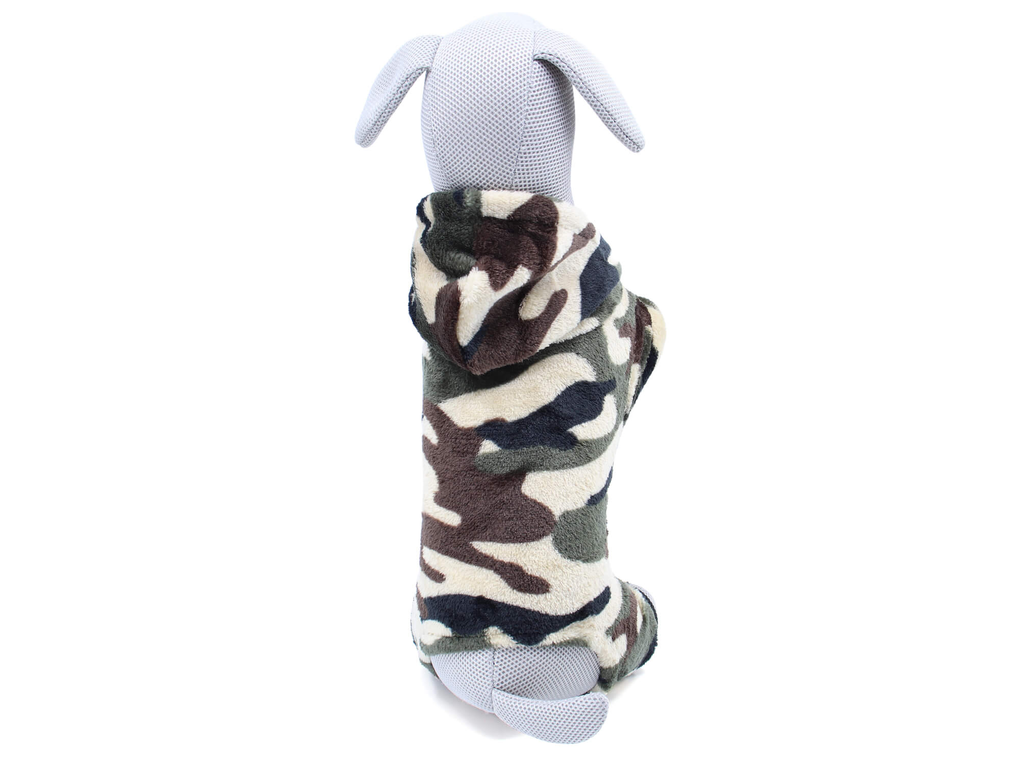 Hřejivá fleecová kombinéza pro psa disponuje snadným zapínáním na patentky na břišní části. Potěší především malá plemena. Velkou výhodou oblečku je to, že zakryje přední i zadní tlapky. Tím, že udržíte psa v teple během chladnějších jarních a podzimních dní, zamezíte jejich prochladnutí. Majitele potěší jednoduchá údržba. V případě ušpinění lze obleček vyprat v pračce. Zajímavé maskáčové provedení. Oblečku dominuje našitá kapuce.