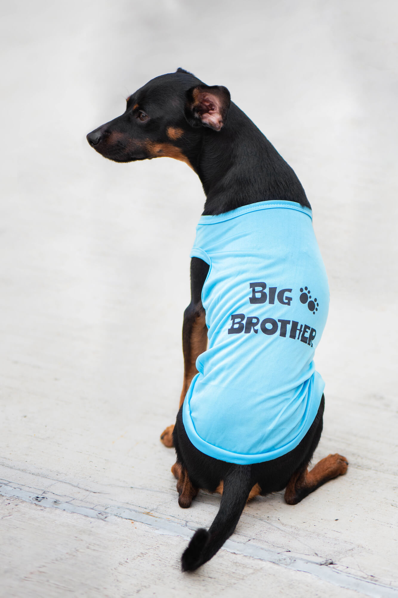 Jak se pozná čtyřnohý velký brácha? Vzorně pečuje o své psí i lidské sourozence a hrdě nosí letní tričko s nápisem – Big brother. Obleček pro psa si oblíbíte díky prodyšnému a příjemnému materiálu, který nezatěžuje kožíšek v teplých dnech.