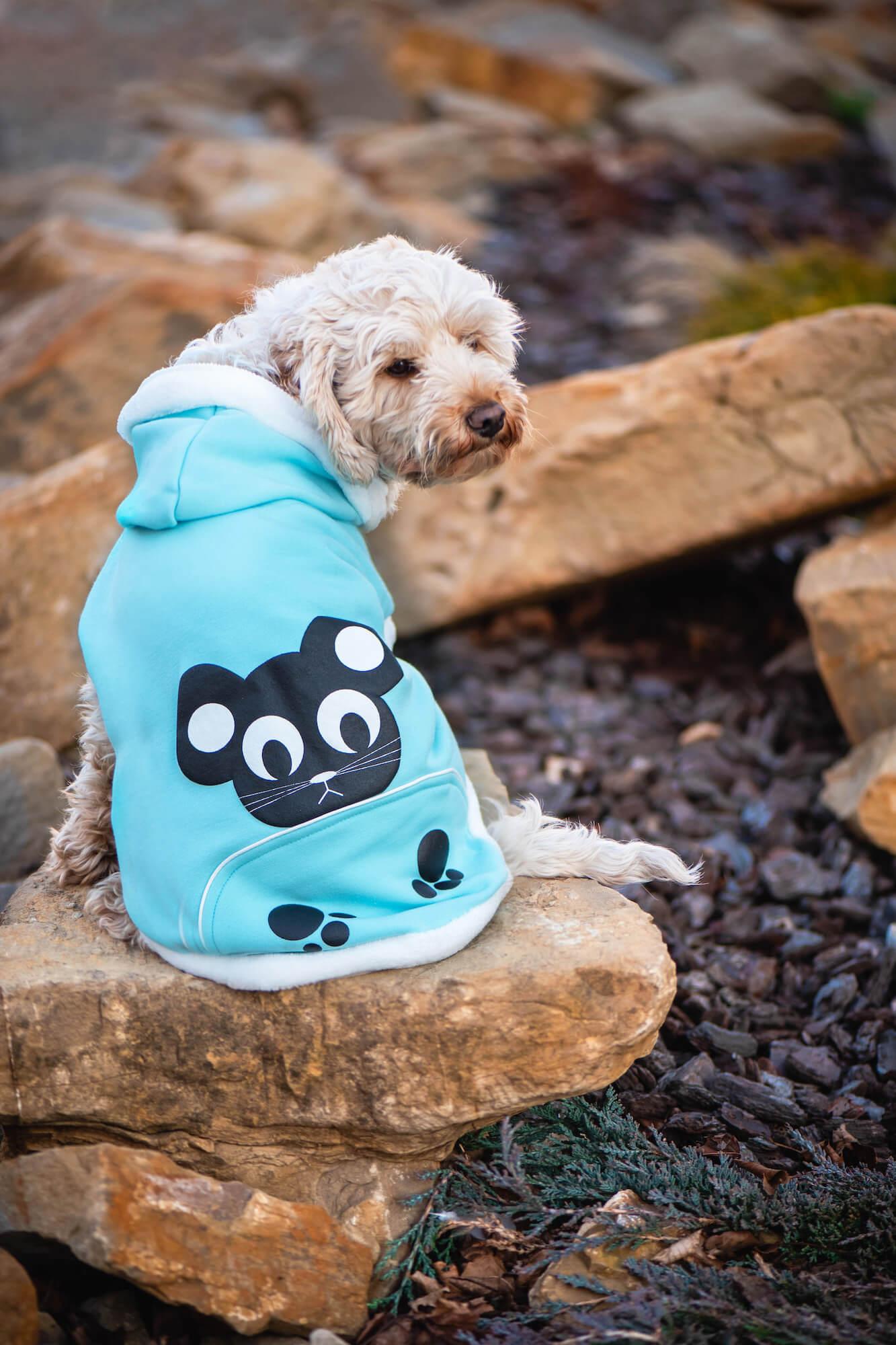Vtipná psí mikina potěší malé a střední psíky. Vybírat je možné z více barevných variant. Na hřbetní straně se nachází černý potisk. Obleček pro psa má kapuci, kterou je možné v nepříznivém počasí nasadit na hlavu. Materiál je velmi pohodlný a Váš pes si mikinku doslova zamiluje. Pro zajištění dostatečné tepelné ochrany je mikina podšita vrstvou hřejivého fleecu. Disponuje snadnou údržbou. Lze vyprat v pračce na 30°C.
