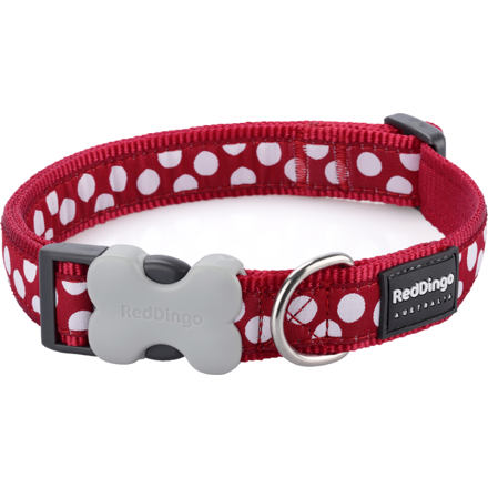 Obojek Red Dingo pro psy s obvodem krku 20 – 32 cm. Šířka popruhu 12 mm. Vzor White Spots on Red.