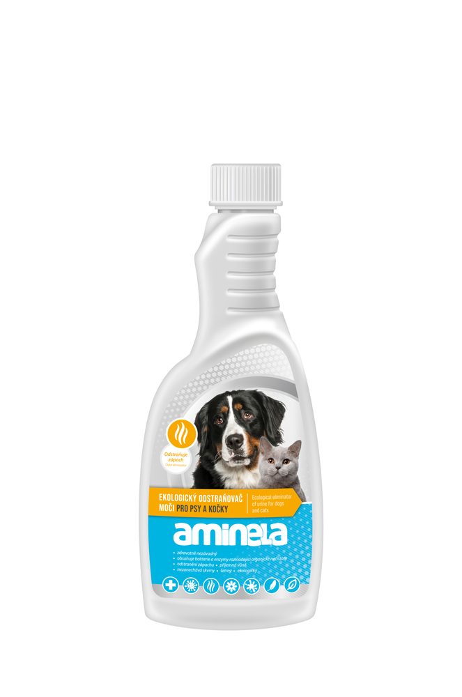 Ekologický odstraňovač moči pro psy a kočky 500ml Aminela Clean odstraňovač moči je zdravotně nezávadný přípravek, který se používá k odstranění zápachu moči psů a koček. Obsahuje bakterie a enzymy, které šetrně a účinně rozkládají organické nečistoty. Přípravek můžete aplikovat na textil, čalounění, koberce, podlahy, pelíšky i na zdivo. Přípravek nezanechává skvrny a má příjemnou vůni. Odstraněním zápachu se předchází dalšímu přeznačkovávání.