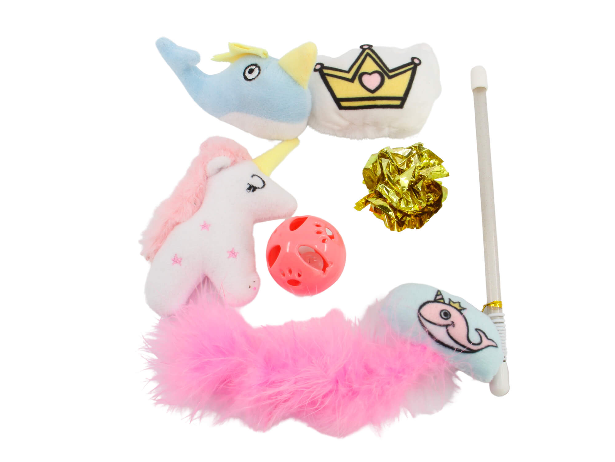 Dárkový set pro kočku obsahuje 6 kousků oblíbených hraček. Skládá se z míčku s rolničkou, plyšové velryby, nosorožce, korunky a plastové udice. Ideální pro koťata, dospělé a starší kočky. Vhodné jak na společné dovádění, tak i k zabavení chlupáčů pří dlouhých chvílích samoty. Hračky pro kočky trénují lovecké dovednosti a vybijí jejich přebytečnou energii. Pro společné hraní se skvěle hodí udice, která navíc utuží Vaše vzájemné pouto.
