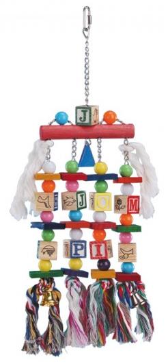 Hračka Nobby k zavěšení do klece. Vhodné pro vetší papoušky. Obsahuje dřevěnné a plastové části hračky, bavlnu a zvonečky. Celková velikost 50 x 15 cm.