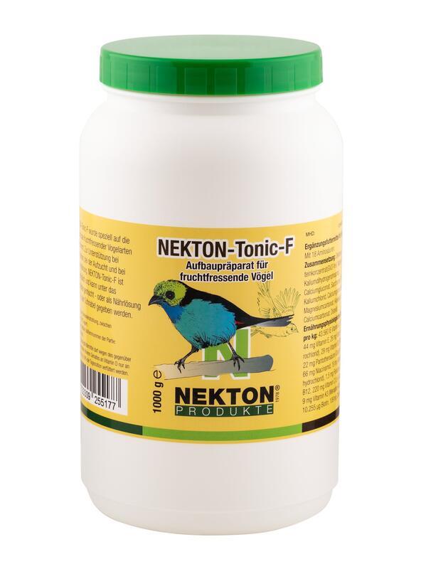 Obohacené krmivo s vitamíny, aminokyselinami a stopovými prvky pro plodožravé ptáky. Superkrmivo pro plodožravé ptáky. Všechny složky NEKTON Tonic F jsou velmi rychle stravitelné, okamžitě působí na organismus a jsou vhodné jako prevence proti nedostatku vitamínů, aminokyselin, stopových prvků i jako první pomoc v případě oslabení organismu, nemoci, zvýšeného stresu (např. z důvodu transportu, rozmnožování apod.) Vhodné pro dlouhodobé používání i jako rychlá pomoc. Různorodost a kombinace více než 60 výživových substancí činí z preparátu NEKTON Tonic F nepostradatelného pomocníka chovatelů ptáků. Množství a poměr jednotlivých složek je pečlivě kombinováno tak, aby vyhovovalo plodožravým ptákům, protože i nutriční požadavky v přírodě se liší podle skladby potravy a potravní specializace. Perfektní potravní doplněk pro dospělé jedince i mláďata. NEKTON Tonic F pro plodožravé ptáky obsahuje kompletní směs všech vitamínů, minerálů, stopových prvků a minokyselin. Navíc je však složen z mnoha substancí, díky kterým můžeme tonikum označit jako superkrmivo. Ideální pro všechny plodožravé ptáky. NEKTON Tonic F může být po omezenou dobu používán i jako kompletní krmivo. Toto je velkou výhodou u nemocných či oslabených ptáků, kteří přijímají pouze minimum normálního krmiva nebo žádné. Složení: dextróza, včelí pyl, isolát sojového proteinu (bez genetických modifikací), chlorid sodný, fruktóza, sója, fosforečnan draselný, glukonát kalcia, sacharóza, hydrogenfosforečnan vápenatý, chlorid draselný, glycerofosfát vápenatý, uhličitan hořečnatý, kyselina křemičitá, uhličitan vápenatý, olej ze světlice barvířské. Nutriční aditiva/kg: 43.560 IU vitamin A, 2.820 IU vitamin D3, 44 mg vitamin E, 26 mg vitamin B1 (thiamin hydrochlorid), 29 mg vitamin B2 (riboflavin), 22 mg kys. pantothenová (calcium-D pantothenát), 66 mg nikotinamid, 19 mg vitamin B6 (pyridoxin hydrochlorid), 1.5 mg kys. foliová, 2.580 ?g vitamin B12, 220 mg vitamin C (kys. L askorbová), 9 mg vitamin K3 (menadion-sodium bisulfit), 10.255 ?g biotin, 110 mg inositol, 109 mg cholin chlorid, 33 mg železo (sulfid železnatý) 0.1 mg zinek (sulfid zinečnatý), 8 mg měď (sulfid měďnatý), 7 mg mangan (sulfid manganatý), 0.09 g molybden (molybdenan amonný). Technologická aditiva: kyselina sorbová.  Dávkování: rozmíchejte 10 g NEKTON Tonic (= 1 velká odměrná lžička, přiložená v balení) ve 100 ml pitné vody (vodu je vhodné obohatit o NEKTON S), nebo posypte 100 g měkkého krmiva 10 g NEKTON Tonic. Nabízejte ptákům 2–3× týdně, nebo denně v případě zvýšeného stresu či onemocnění. Při přímém krmení mláďat doporučujeme přidat vlákninu, např. vařenou rýži, ve které rozmícháme NEKTON Tonic. Uchovávejte na tmavém a suchém místě při teplotě 15–25°C. Neskladujte v ledničce!