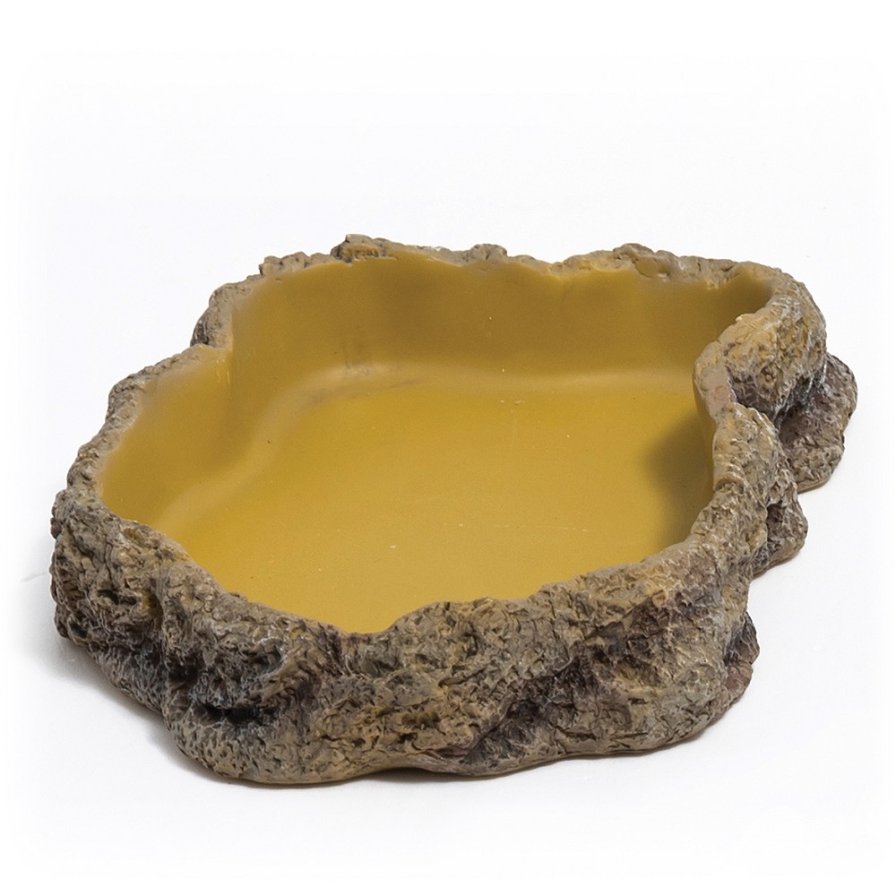 Miska na krmivo pro terarijní živočichy velikosti L. Nádoba je vyrobena z bezpečného polyresinu. Povrchová úprava je zpracována tak, aby miska svým vzhledem co nejvíce připomínala přírodní dekoraci, kámen, skalku, apod. Misky jsou tvarovány odlitím ve formách a jsou mimořádně odolné.