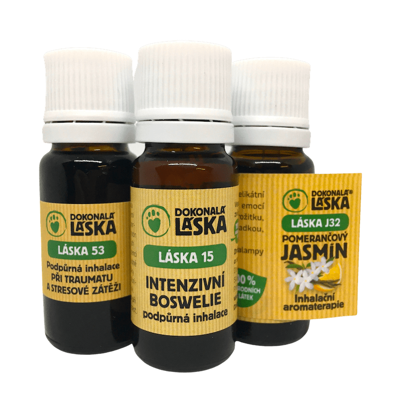Představujeme jeden z balíčků pro útulky, který ocení každý z azylů, depozit, neziskových organizací starajících se o pejsky. Balíček obsahuje: LÁSKA 53 Při traumatu a stresové zátěži podpůrná inhalace, LÁSKA 15 Intenzivní boswelie podpůrná inhalace a LÁSKA J32 Pomerančový jasmín LÁSKA 53 Při traumatu a stresové zátěži je unikátní inhalační směs určena pro psy s projevy posttraumatického stavu, nebo při akutním traumatu. Stav projevující se bázlivostí, uzavřením, úzkosti, obrannou agresivitou i z důvodu strachu sám o sebe, poruchou učení, roztěkaností, nadměrnou excitací a emoční nestabilitou. Je vhodná právě pro ty, kteří netolerují manipulaci, nebo je pro ně zátěží. LÁSKA 15 Intenzivní boswelie je jedinečná inhalační směs tří tradičních látek, a to Boswellia serrata, Boswellia carterii a Commiphora myrrha. Hlavní účinné konstituentní látky, které vykazují analgetické a protizánětlivé účinky. Důsledkem aktivit látek v organizmu je možné sledovat zmírnění bolesti pohybového aparátu, snížení otoků a zvýšení pohyblivosti kloubů. Vhodné pro starší zvířata s chronickými pohybovými obtížemi. Vhodné pro sportovně aktivní zvířata. Vhodné při akutních pohybových obtížích a při rekonvalescenci pooperačních stavů. Vhodné pro zvířata s epilepsií díky prokazatelně harmonizačnímu efektu účinných látek. Inhalační směs je vhodná při onemocnění dýchacích cest. LÁSKA J32 Pomerančový jasmín má příjemně relaxační, lehce dezinfekční a antibakteriální účinek. Složení této směsi je plně přizpůsobeno jak lidskému prožitku, tak velmi jemnému čichu psů. Tuto vůni člověk prožívá jako svěže sladkou, příjemně harmonizující. A stejně ji vnímá i většina psů. Je to vůně lásky, harmonizace a míru. Jedná se o kompozici čtveřice čistě přírodních látek. Hlavní tón ve směsi udává jasmín (Jasminum grandiflorum). Skutečný, ryze přírodní, neodolatelný. V aromapsychologii má tento jasmín velmi široké využití – při depresivních stavech, úzkostech, emoční labilitě, ale například i při sexuálních potížích. Jasmín je výkonný stabilizátor emocí. Další složkou je santal (Santalum album), který důmyslně propojuje jasmín s třetí látkou, kterou je silice sicilského rudého pomeranče (Citrus sinensis). Santal bývá v aromaterapii používán při psychických krizích, frustraci a při podrážděnosti. Jedná se o harmonizant s rovnoměrně vyváženým účinkem stimulačním, adaptogenním a relaxačním. Pomeranč je stabilizátor emocí s vyváženým stimulačním i relaxačním působením. Posiluje činnost pravé mozkové hemisféry. Kompozici unikátně dotváří a zaobaluje esenciální olej z resinu skutečné madagaskarské vanilky (Vanilla planifolia). Vanilka je velmi silný relaxant, uklidňuje při úzkosti, nervozitě, podráždění, je vhodná i při nespavosti a nechutenství.