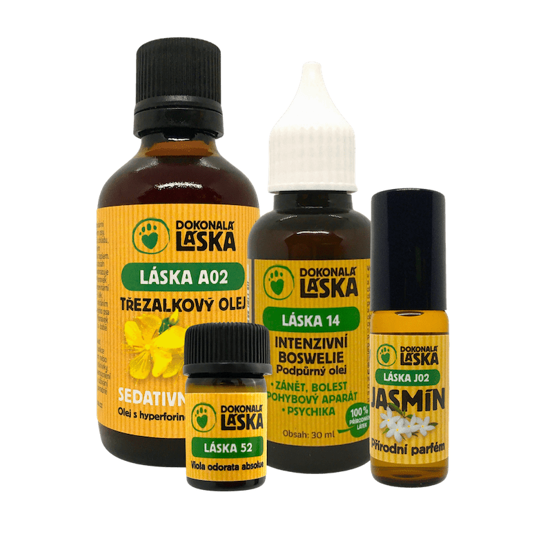 LÁSKA A02 třezalkový olej 100ml + LÁSKA 52 Viola odorata 1ml + LÁSKA 14 Intenzivní boswelie 50ml + LÁSKA J02 Jasmín terapeutický parfém 1ml