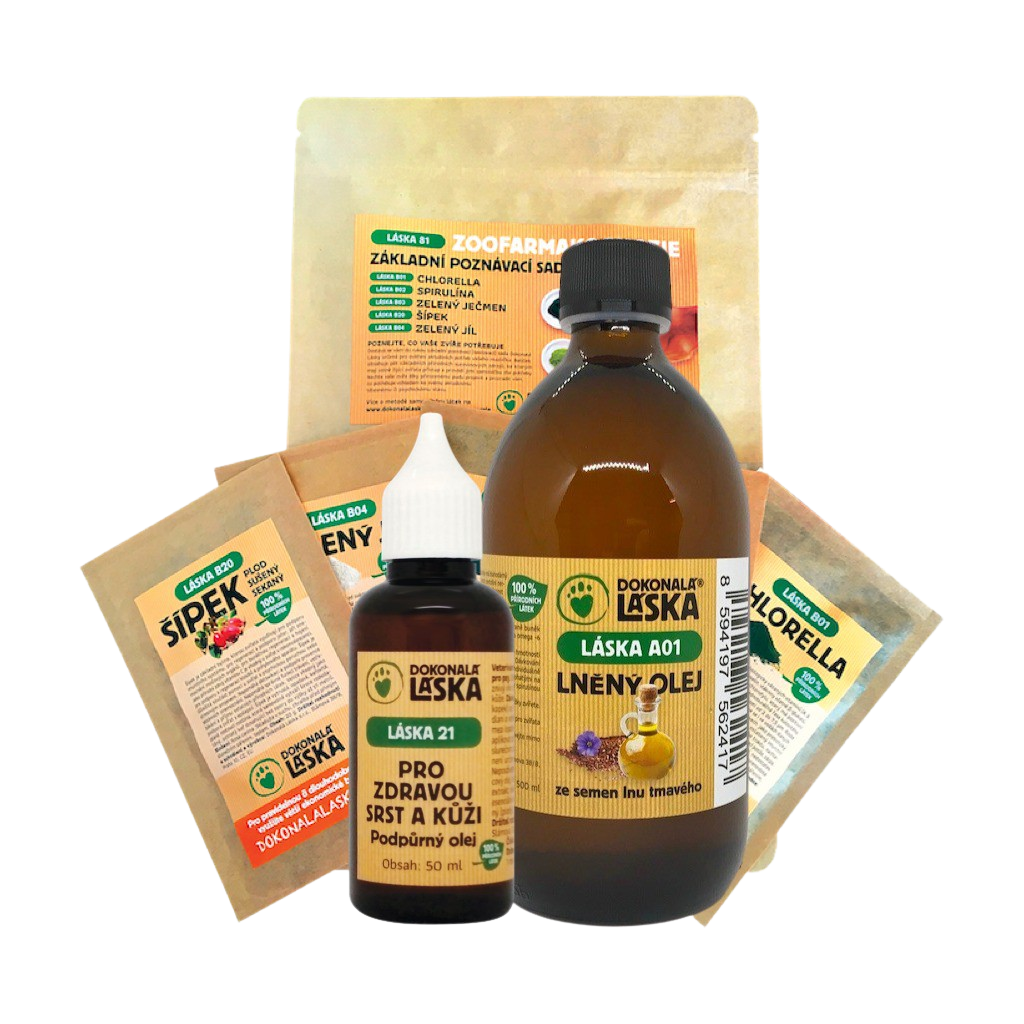 LÁSKA 21 Pro zdravou kůži a srst 50ml + LÁSKA A01 Lněný olej 500ml + LÁSKA 81 Poznávací sada