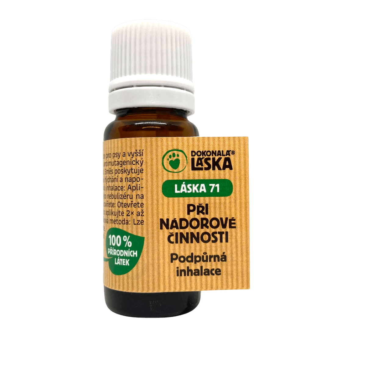 Čistě přírodní veterinární přípravek pro zvířata v zájmovém chovu. Podpůrná inhalace pro psy a vyšší savce. Přírodní látky ve složení přípravku Láska 71 Při nádorové činnosti poskytují prokazatelný antiproliferativní, antimutagenický, cytotoxický a antioxidační účinek, a mohou tak napomoci zpomalení nádorové činnosti a zamezení dalšího rozšiřování (metastází). Směs poskytuje také protizánětlivý účinek a působí úlevně při bolesti. Podporuje normální dýchání a napomáhá pročištění dýchacích cest . Obsah balení: 10 ml