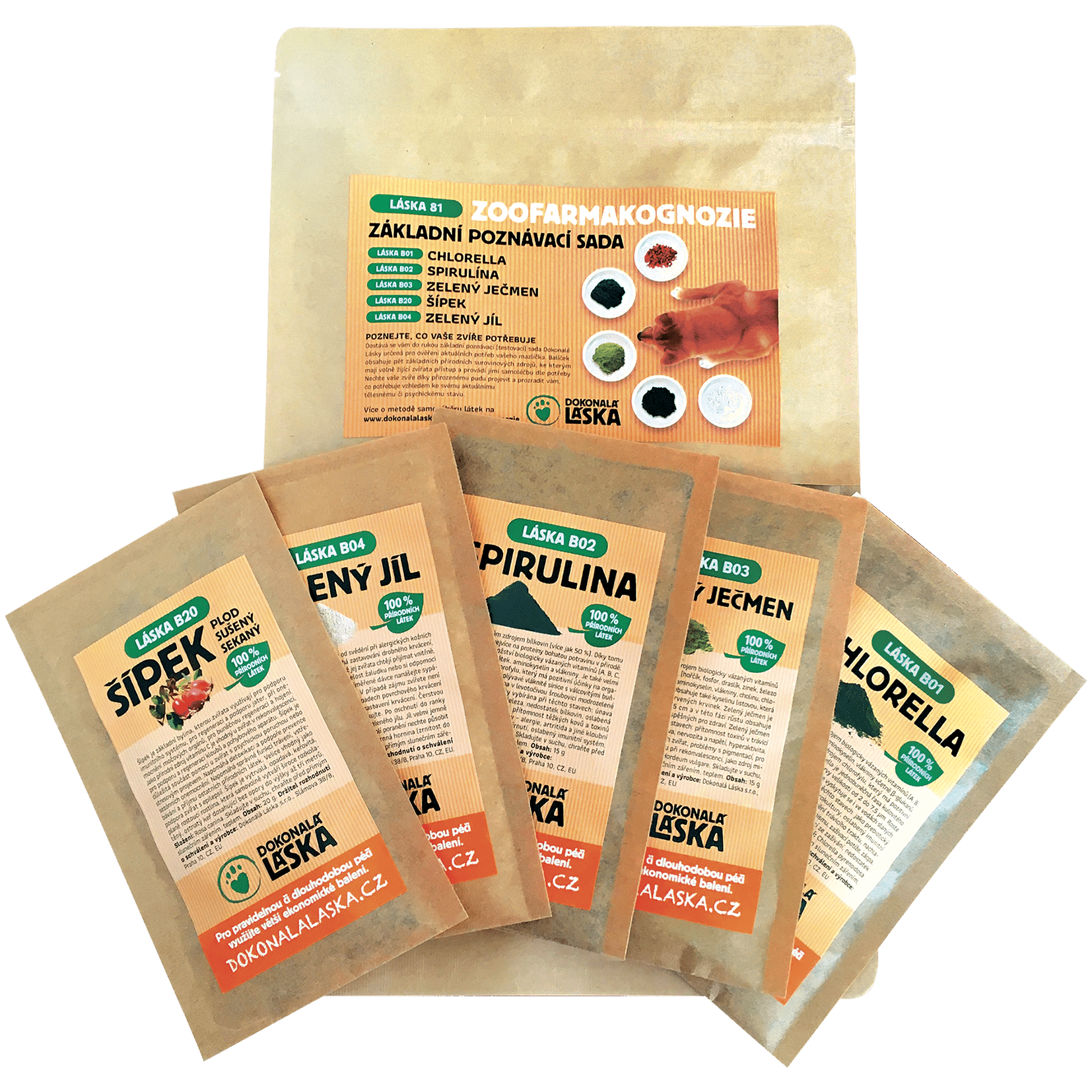 Se základní poznávací sadou zoofarmakognozie můžete zcela bezpečně prozkoumat, jakou přírodní látku vaše zvíře uvítá pro své zdravotní či psychické samoléčení. Vy pak nemusíte pořizovat doplňky a přípravky jen podle lidského (a tedy dost nejasného) úsudku. Budete vědět, po čem sáhnout , protože si to vaše zvíře tak vybralo. Věřme svým zvířatům a nechme se inspirovat! Nechte své zvíře, aby vám ukázalo, jakou vnitřní podporu aktuálně opravdu potřebuje . Proč byste dávali nějakou podpůrnou látku každodenně, a ještě k tomu do potravy, když ji vaše zvíře třeba nepotřebuje? Nechte si poradit. Zvířata mají funkční vomeronasální orgán, který my lidé máme zakrnělý a neumíme využívat. Ale zvířata ano – a skvěle. Díky tomuto orgánu a pudové výbavě lehce zanalyzují každou přírodní látku a její aktuální prospěšnost pro organismus. Proveďte test se Základní poznávací sadou a zjistíte, jaká podpora bude nejvhodnější. Navíc se svým zvířecím přítelem zažijete něco zvláštního a přitom tak přirozeného… Co dělat po provedení testu? Je to jednoduché – pořiďte větší balení suroviny, kterou zvíře vybralo, a tu pak pravidelně nabízejte k dobrovolnému příjmu. Ověření preferencí zvířete provedením testu doporučujeme opakovat 4x během roku. Přírodní doplňky (suplementy) zásadně nepřidávejte do krmení – nepoznáte, kdy už je tělo nepotřebuje! Což může být drahé a zatěžuje to zbytečně organismus. Je lepší podávat suroviny tak, abychom zjistili, jestli o ně zvíře stále ještě má nebo nemá zájem (fanatický, střední, váhavý, či odmítavý). Sada obsahuje 5 poznávacích balíčků: LÁSKA B01 Chlorella jako prebiotický zdroj s vysokým obsahem vlákniny. LÁSKA B02 Spirulina která je také označována za super potravinu s vysokým obsahem bílkovin Obě dvě tmavě zelené suroviny obsahují vitamíny, minerály, stopové prvky a chlorofyl. LÁSKA B03 Zelený ječmen je výkonný antioxidant a zdroj aminokyselin a kyseliny listové. LÁSKA B20 Šípek sušený sekaný je bohatým zdrojem vitamínu C, který je vhodný pro posílení imunitního systému a napomáhá distribuci dalších látek v organizmu. Také podporuje činnost enzymů produkujících kolagen. LÁSKA B04 Zelený jíl je jemně mletá hornina, která obsahuje kaolin. Zvířata jej vyhledávají pro vetření do kůže při svědění, zarudnutí a různých alergických projevech. Zelený jíl také napomáhá hojení drobných poranění a zastavuje malá krvácení. Olizování nebo vnitřní příjem jílu rozmíchaného s vodou naznačuje, že zvíře chce snížit kyselost žaludku nebo si odpomoci od toxinů. Co a proč zvíře vybírá? Důvod výběru jednotlivých látek jsme pro Vás detailně popsali přímo na balíček testovací sady. A samozřejmě jsme Vám plně k dispozici pro konzultaci výsledku i přímo v naší poradně: poradna@dokonalalaska.cz, tel.: +420 603 421 744. Cílový druh zvířat: psi, kočky, hlodavci, koně, plazi, drobné i velké šelmy, ježci Tip: Natočte průběh testu a výběr látek na video a pošlete k posouzení. Ale výsledky bývají natolik srozumitelné a přesvědčivé, že to nebude nejspíše zapotřebí.. kontakt: poradna@dokonalalaska.cz Co je zoofarmakognozie? Zoofarmakognozie je úžasná metoda samovýběru účinných látek. Zvířata se umí sama diagnostikovat i léčit a je nyní na nás, abychom jim to umožnili. Když jim toto umožníme, dokáží nám během chvilky o sobě říci více, než jsme schopni se o nich naučit za celý život. Zoofarmakognozie je skvělou cestou k napravování vztahů mezi člověkem a ostatními tvory. Jak to vlastně funguje? Popišme si to co nejvíce jednoduše – když se zvíře v přírodě setká s neznámou věcí (plodem, listem, kořenem a podobně), provede její analýzu a vyhodnotí ji z hlediska užitečnosti nebo nebezpečnosti pro svůj organizmus. Využívá k tomu olfaktorní systém, respektive vomeronasální orgán. Zvíře v přírodě tedy testuje a analyzuje chemické látky a podle vyhodnocení je případně účelně užívá. Aplikovaná zoofarmakognozie je způsob, jak tento princip umožníme i zvířatům, které nežijí v přírodě, tedy nejčastěji psům, kočkám, menším savcům, koním a dalším.